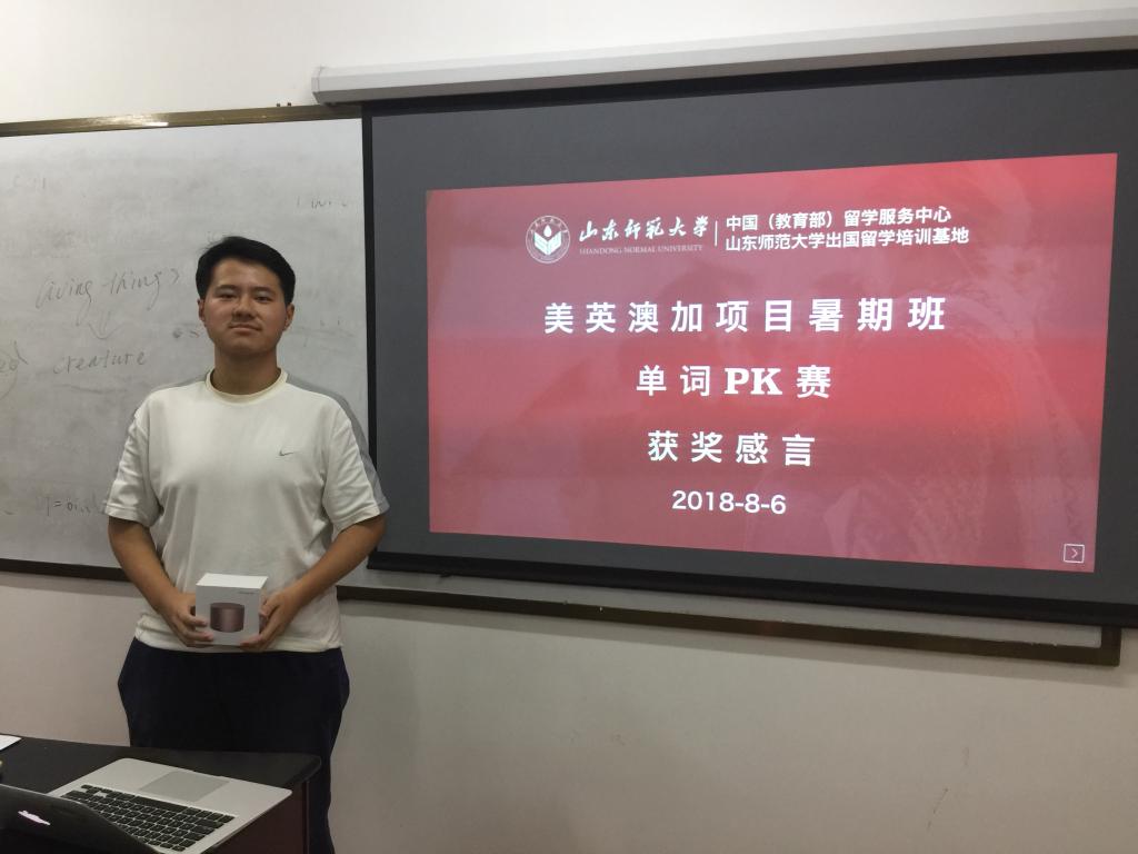 “经过为期十五天酷暑下的磨练,我们圆满完成了暑期班的课程。我们的知识得到了系统的补充,我们的能力得到了提升,也见识了山师大老师们渊博的知识,还领略了山师大留培基地严中有爱的管理,我们无论是在自主学习能力还是独立生活能力上都得到了锻炼,这次暑期班不仅为我们秋季开学奠定了基础,也为我们今后的学习生活做好了准备。同学们,让我们不负青春好时光,勇闯留学新征途!”